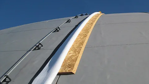 Schon bald sollen über einen 4 Meter hohen Einbringturm bis zu 300 Tonnen Salz pro Stunde in diese neue Lagerhalle befördert werden. Von dort kann das Salz direkt verladen werden, vor allem auf Schiffe, die europaweit Kunden bedienen. Mit einem Durchmesser von 45 Metern und einer Höhe von 29 Metern im Scheitelpunkt entsteht ein mächtiger Kuppelbau mit angeschlossener 600 m2 großen Verladehalle. Auf einem runden Betonsockel wurde ein Schalentragwerk aus Holz montiert. Das Tragwerk wurde für die Montage in 16 einzelne Dachsegmente unterteilt, die im Firstbereich an einen Stahlkranz mit einem Durchmesser von 4 Metern treffen. Ein spezielles Gerüst wurde dafür aufgestellt, welches den Stahlkranz vorübergehend trug. Die einzelnen Segmente bestehen aus geteilten Brettschichtholz-Hauptbindern mit Nebenträgern, teilweise mit integrierten Lichtkuppeln, Beplankung mit OSB-Platten als schubsteife Dachscheibe und Dachabdichtung. Der Hauptbinder mit einer Bogenlänge von 26,50 m wurde der Länge nach in zwei Teilbinder mit je 14 cm Breite geteilt, um bei der segmentierten Bauweise den optimalen Halt zu gewährleisten. Gleichzeitig wurde oberseitig an den Verbindungspunkten eine zusätzliche OSB-Platte sowie eine weitere überlappende Abdichtung angebracht, um das Holz gegen eindringende Feuchtigkeit zu schützen. Beim Bau von Salzhallen ist darauf zu achten, dass die verwendeten Materialien nicht auf Dauer vom Salz angegriffen werden. Holz eignet sich hierfür besonders gut, denn Holz ist gegenüber Salz resistent und braucht keine chemische Beschichtung – das Salz trägt sogar zur besseren Konservierung des Holzes bei.Weitere Informationen: