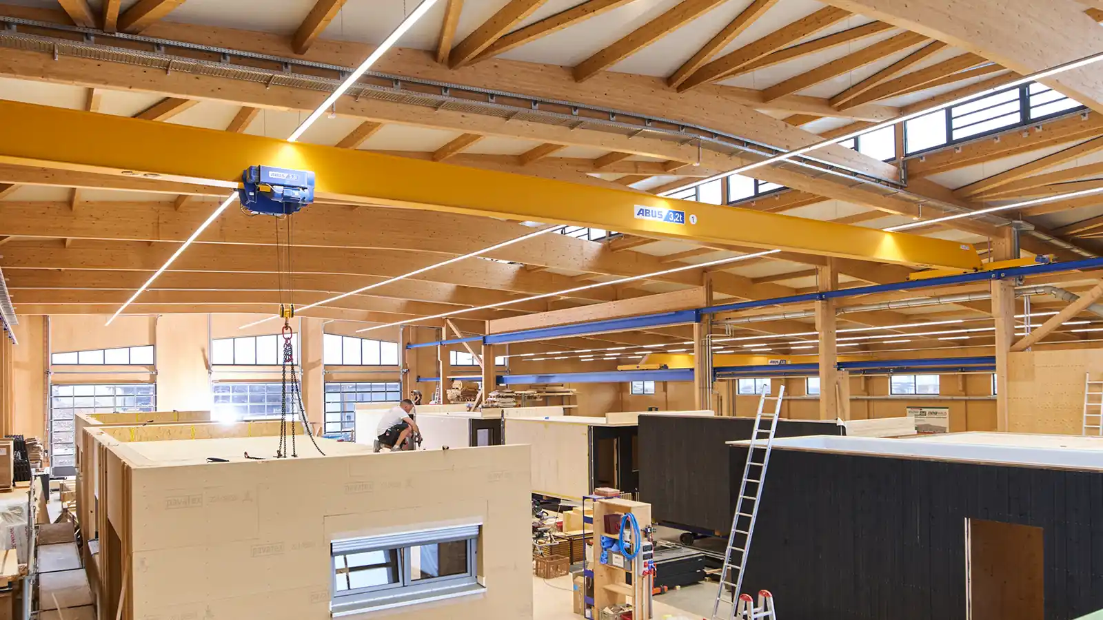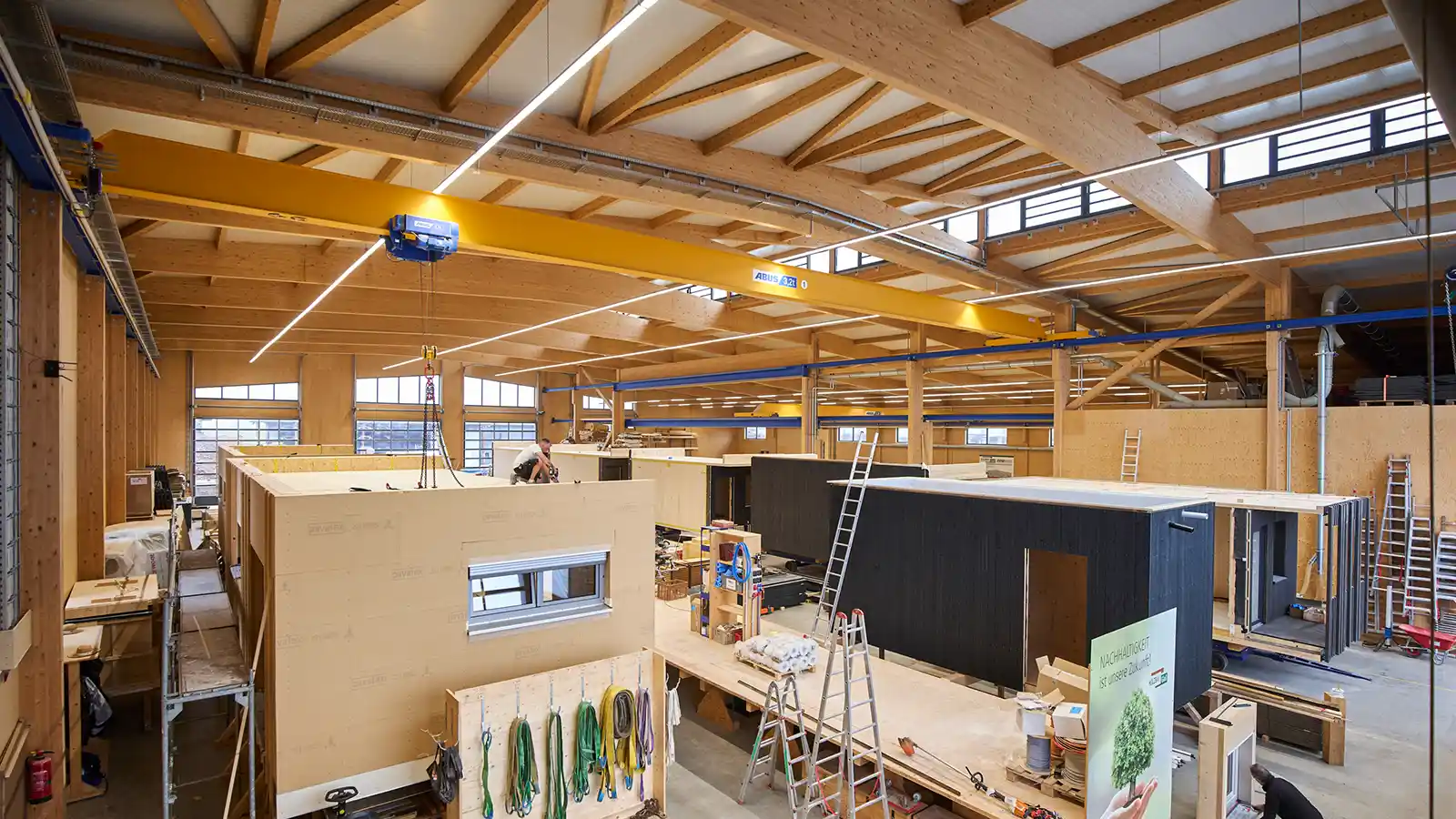Die neue Produktionshalle von Holzbau Glaß setzt Maßstäbe: Mit 54 m Länge, 25 m Breite und einer Firsthöhe von 12 m bietet sie insgesamt 1.350 m² Nutzfläche. Damit zählt sie zu den größten Abbundhallen, deren Holztragwerk von Schaffitzel gefertigt wurde.