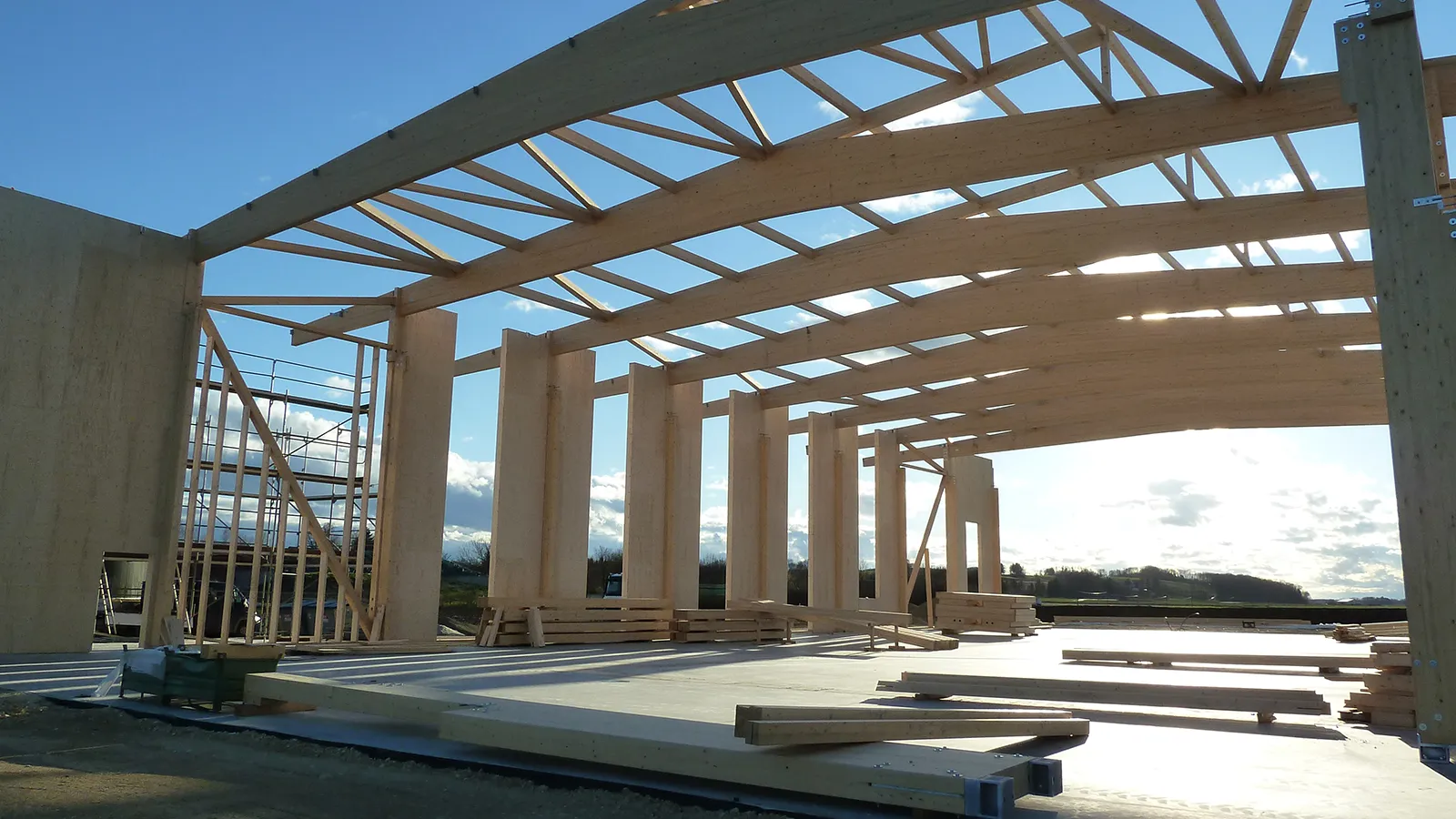 Konstruktion: | Holztragwerk-Bausatz mit 6° Satteldachbindern und Holz-Kranbahnstützen |