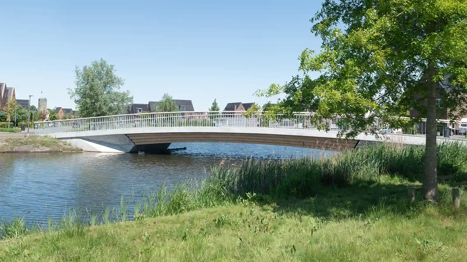 Im Groninger Stadtteil Meerstad erweitert die Brücke „Ter Sluis“ die Reihe der neu errichteten Brücken mit einem klaren und architektonisch anspruchsvollen Erscheinungsbild. Sie ersetzt den bisherigen Damm, der den Bootsverkehr blockierte, und eröffnet mit einem lichten Durchfahrtsprofil von 1,5 x 4,0 m eine freie Passage.