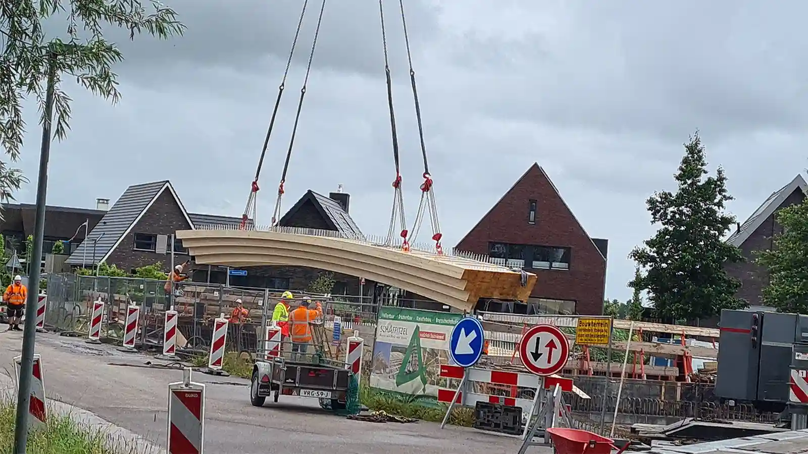 Die Brücke ist wurde im Holz-Beton-Verbund ausgeführt: Das Tragwerk setzt sich aus drei parallel angeordneten Brettschichtholzträgern zusammen, die über eine Stahlbeton-Fahrbahnplatte miteinander verbunden sind. Die Holzträger sind biegesteif in den Widerlagern verankert. Kerven gewährleisten den Schubverbund, während eingebohrte Schrauben zusätzliche Sicherheit gegen abhebende Kräfte bieten.