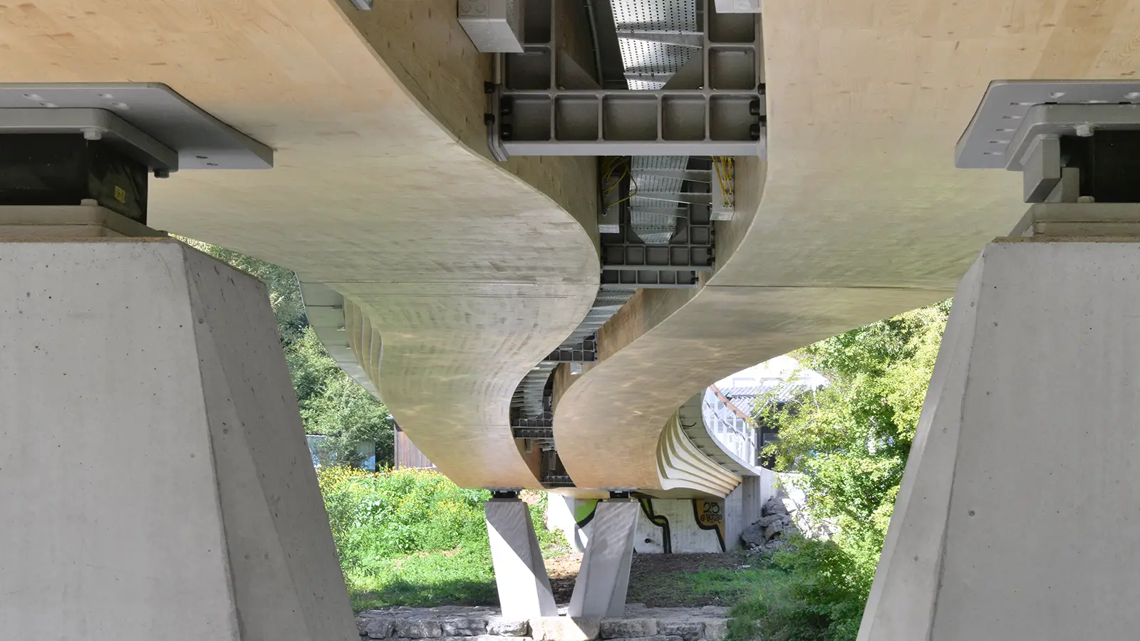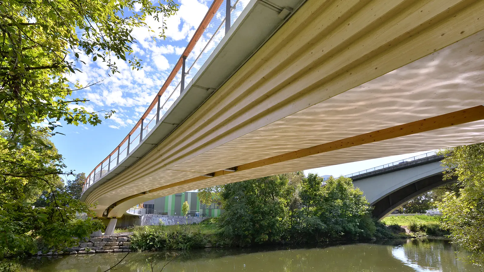 Die Stadt Tübingen entschied sich bewusst für eine nachhaltige Lösung: Die Brücke wurde in moderner Holzbauweise umgesetzt. Ihre S-förmige Linienführung erfüllt nicht nur funktionale Anforderungen, sondern setzt auch gestalterisch ein Zeichen. Die barrierefreie Konstruktion basiert auf zwei gebogenen Brettschichtholzträgern, die ein Dreifeldsystem mit einer Gesamtlänge von knapp 70 Metern bilden. Je nach statischer Beanspruchung variierten die Querschnittshöhen der Träger. Die Felder sind längs durch Gerbergelenke verbunden, quer sind sie über Stahlrahmen gekoppelt.