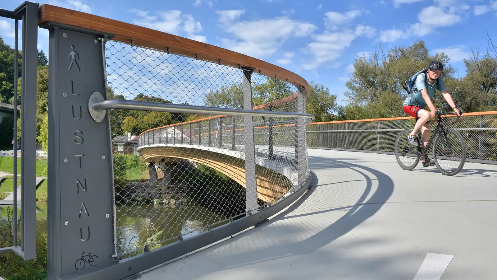 Ein neues architektonisches Highlight in Tübingen: Eine rund 70 Meter lange Holzbrücke ersetzt den ehemaligen Bankmannsteg. Die neue Fuß- und Radwegbrücke verbindet das Stadtviertel Lustnau mit den Freizeiteinrichtungen in der Bismarckstraße – und bindet zukünftig an den geplanten Radschnellweg Tübingen - Reutlingen an.